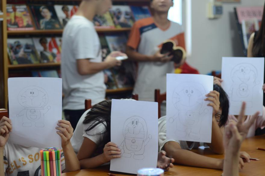 女孩子们喜欢细腻的有趣的游戏,队员们为此准备了萌萌哒的绘画教程,教给她们基本的绘画基础,将哆啦A梦、海绵宝宝、小黄人等深受喜爱的动漫形象以简单的轮廓组合起来,再稍加修饰、修改,萌萌哒的形象就出现在各位小同学的画纸上。