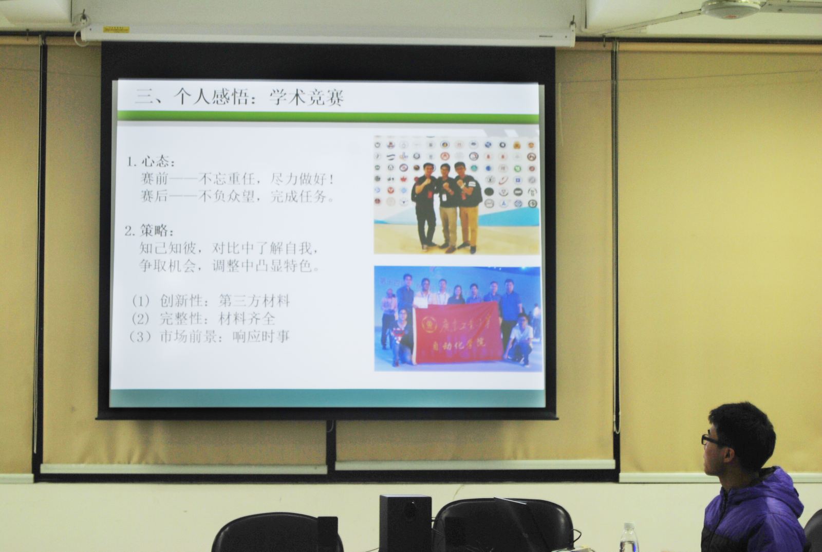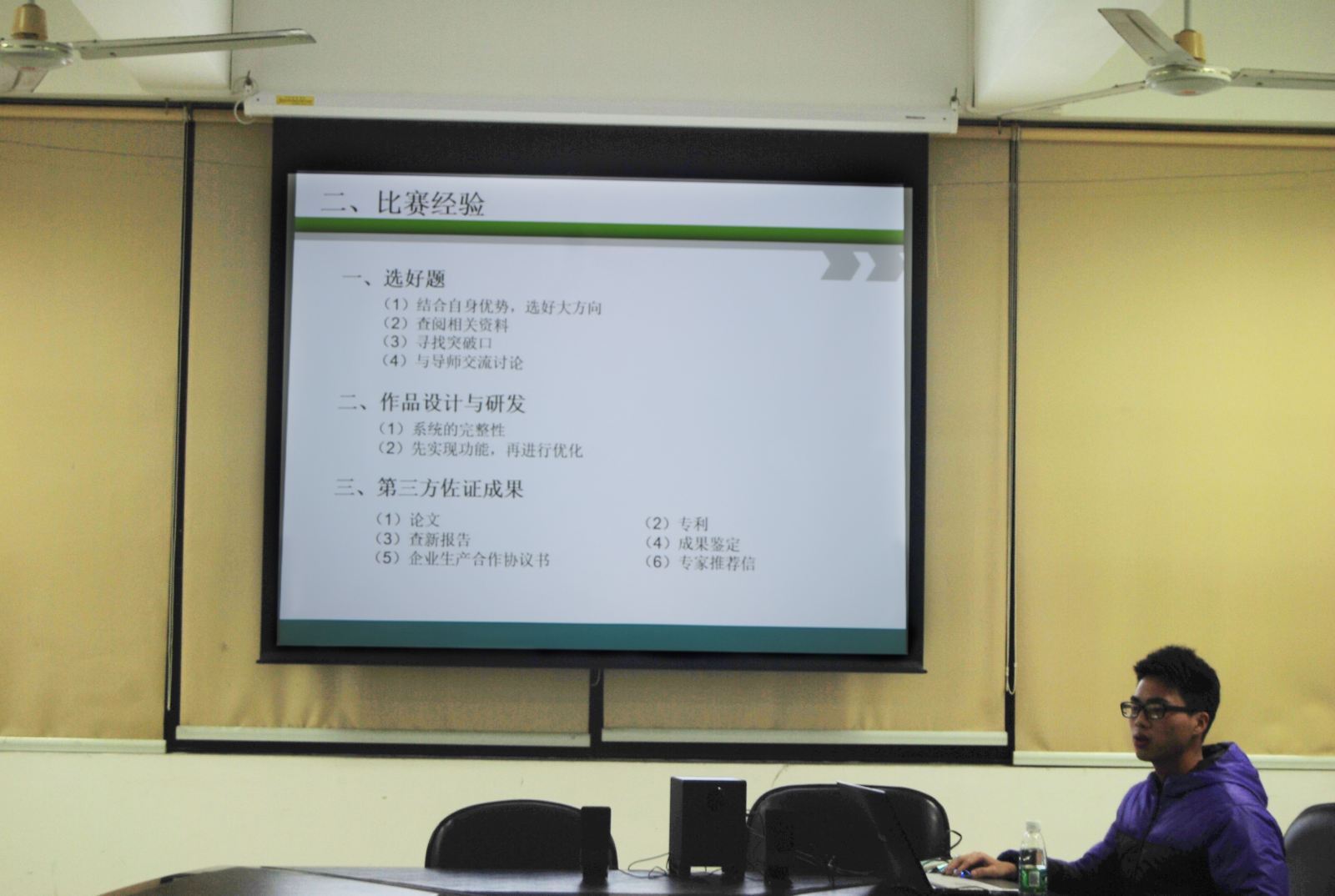 于12月17晚在工三220举办了创新创业系列活动第二讲——“挑战杯”经验交流会。第十四届“挑战杯”国赛荣获特等奖的参赛团队核心成员康嘉文分享了他在参赛过程中的心路历程和经验感悟。