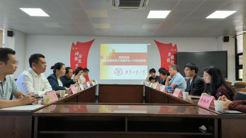 周东斌致欢迎词,并介绍了学校、学院的基本情况和办学特色,就人才培育、学生就业、产学研合作等方面进行交流和探讨,期待加强校地合作,形成优势互补,为玉林市乃至祖国西部发展贡献广工力量。