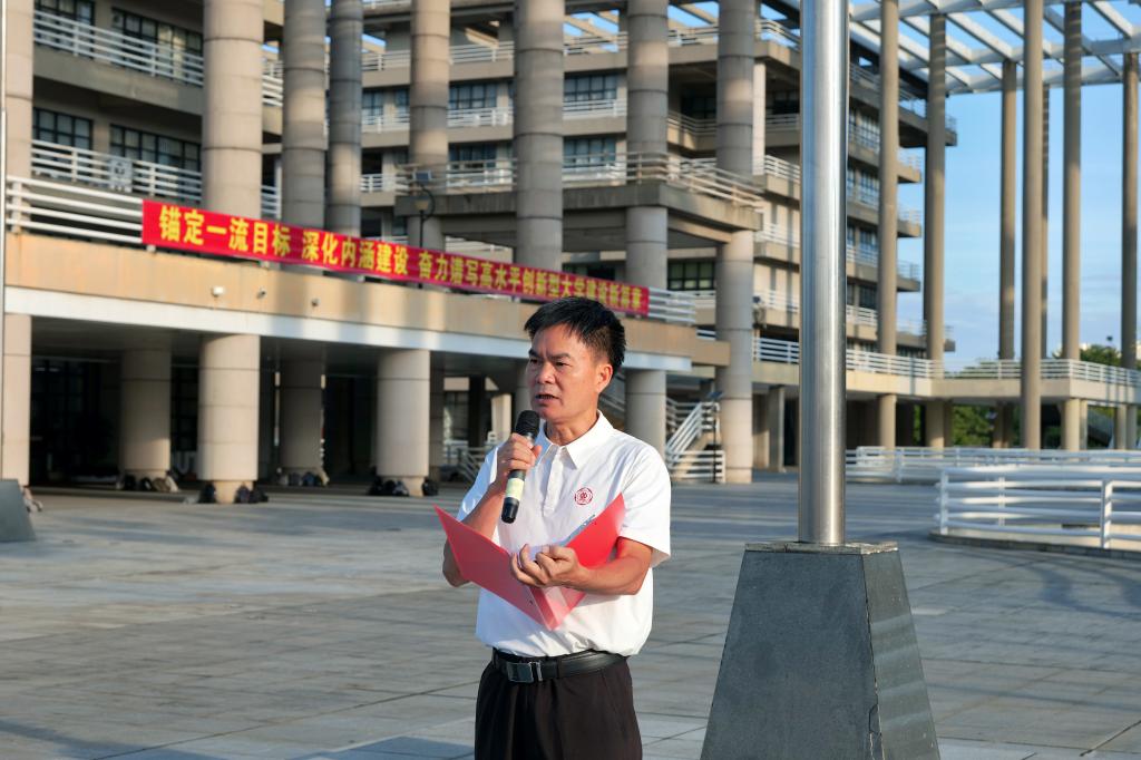 升旗仪式后,学院党委书记周东斌老师作讲话。结合刚刚结束的纪念中国人民抗日战争暨世界反法西斯战争胜利80周年大会,周书记指出,从抗战胜利到新时代强军兴军,从先辈浴血奋战到今日大国重器,充分展现了中华民族从站起来、富起来到强起来的伟大飞跃。站在新的历史起点,他向全体新生提出三点希望:一要传承红色基因,厚植爱国情怀,将阅兵场上展现的民族自信和强国力量转化为坚定理想信念的不竭动力;二要勇立时代潮头,敢当创新先锋,以阅兵式中展现的科技强军精神为榜样,在专业领域勇攀高峰,在科技自立自强的道路上跑出“广工学子”的加速度;三要锤炼过硬本领,担当复兴大任,在实现民族复兴的赛道上奋勇争先。